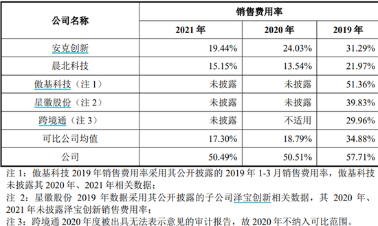 2021年,赛维时代的销售费用率高达50.49%,比安克创新、晨北科技高出30%以上,也比致欧科技高出10%以上。此外,可以看到,同行随着销售规模的扩大,销售费率均有明显的下降,而赛维时代连续3年销售费率都在50%以上,对此,其只给出了渠道开拓之类的通用理由,没有做出特别解释(表7)。