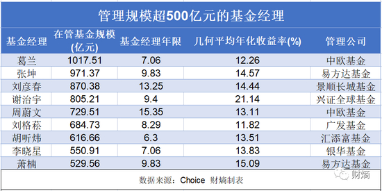 根据东方财富Choice数据显示,截至2022年二季度末,有9位主动权益类基金经理管理规模超过500亿元。其中,“公募一姐”葛兰的管理规模重回千亿以上;“公募一哥”张坤的管理规模提升120亿至971.37亿,离回归“千亿顶流”之位仅一步之遥。