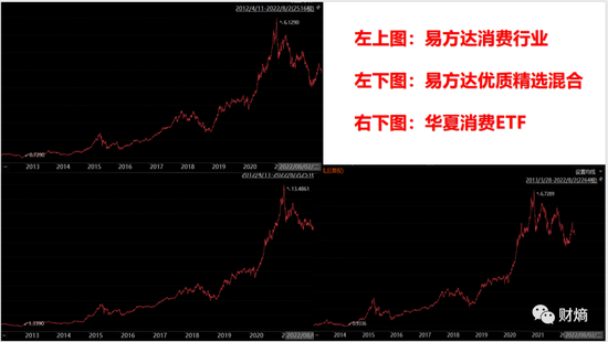 所以在这些年里,诸多重仓消费股的基金,业绩表现都十分突出。例如以跟踪上证主要消费行业指数为代表的华夏消费ETF,2016-2021年这5年间累计收益率接近500%;此外,张坤掌舵的易方达中小盘基金(现更名为“易方达优质精选混合”),同样因重仓白酒、家电等消费股得以在2016年之后声名鹊起,其收益率增长曲线几乎与易方达消费行业如出一辙。
