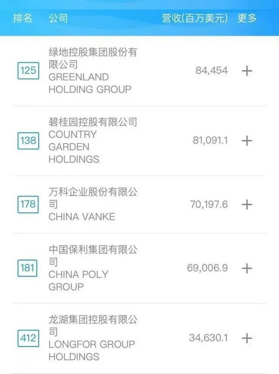 不过,今年中国只有5家房企上榜,比上年少了3家。留在榜单上的5家房企依次是:绿地控股集团股份有限公司、碧桂园控股有限公司、万科企业股份有限公司、中国保利集团有限公司、龙湖集团控股有限公司。
