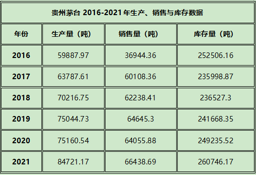 贵州茅台2021年报显示,报告期企业生产量为84721.17吨,销售量56438.69吨,拥有260746.17吨库存量。需要强调的是,丁雄军在分享中所谈到的可能是茅台集团基酒数量,但考虑到贵州茅台占据集团酒板块绝对份额,两者相差预计不会太大。