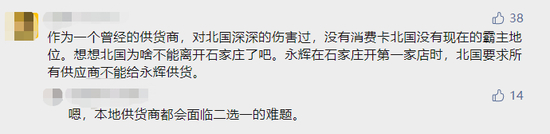 另有网友指出:“永辉在石家庄开第一家店时,北国就要求所有供应商不能给永辉供货,本地供货商都会面临二选一的难题。”