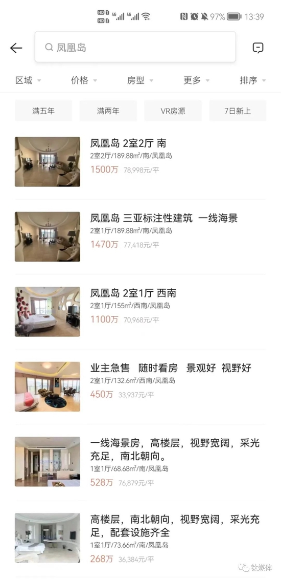 钛媒体App查询贝壳平台发现,目前凤凰岛共有14套住房在售,最高单价达78998元/平米,最低则仅为33937元/平米。