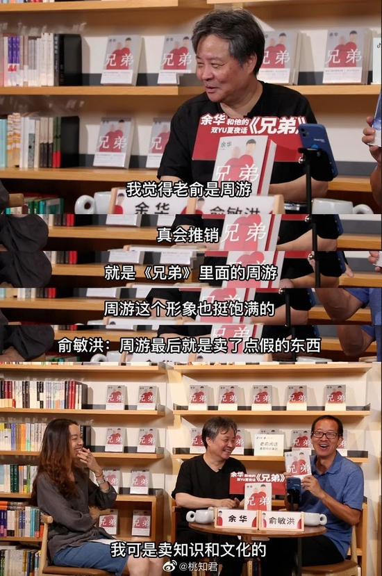 直播中,俞敏洪问余华自己像他笔下的谁,余华想了半天说他像《兄弟》里的周游。周游是个能说会道的商人,小说里这样描写,“周游这个江湖骗子把我们刘镇的群众完全给镇住了,群众挤来挤去围着他,崇拜地看着他,耸起耳朵听他说,一直到凌晨一点钟了,群众才散去。”