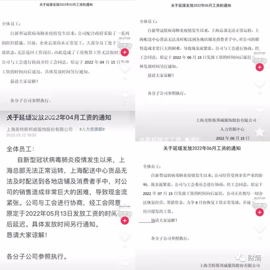 美邦服饰此前发布的延缓发放薪资的通知 图源美邦员工抖音号