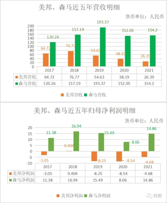 近五年以来,美邦服饰的营收每况愈下,从2017年的64.72亿元下滑至2021年的26.39亿元,归母净利润更是血亏不止,五年累计亏损高达超过20亿元;而森马服饰越战越勇,营收从2017年的120.26亿元增加至2021年的154.20亿元,净利润也颇为可观,五年累计实现66.73亿元盈利。