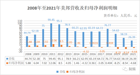 为扭亏为盈,2016年,美邦服饰开始“变卖家产”。当年,其通过出售子公司获益5.5亿元,取得3616万元的净利润。然而“病来如山倒”,这些年美邦服饰始终未能走出盈利焦虑,2017年至2021年,其营收分别为64.72亿元、76.77亿元、54.63亿元、38.19亿元、26.39亿元,净利润分别-3.05亿元、4036万元、-8.25亿元、-8.54亿元、-4.68亿元。