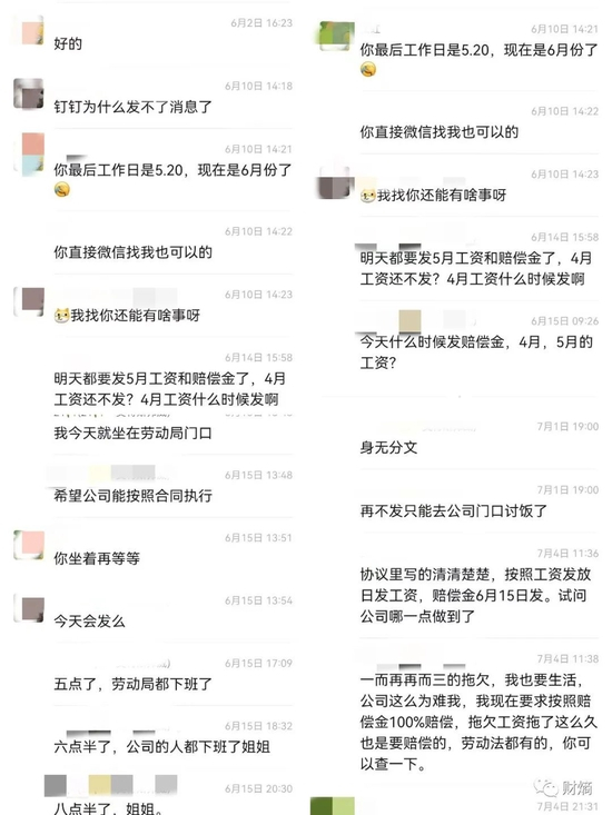而当陈敏追问“赔偿金的具体构成”、“工资何时发放”等问题时,人事的态度也很耐人寻味:“人事对于我的消息都是选择性回复,只有在提到劳动局才会回我”。