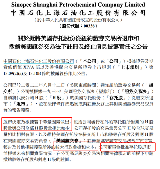 此外,8月12日,上海石油化工股份在港交所公告称,公司已于2022年8月12日通知纽约证券交易所公司拟根据1934年美国证券交易法(经修订)自愿将代表公司H股的美国存托股份从纽交所退市,并在法律条件成熟后撤销注册及终止其对美国证券交易委员会的报告义务。