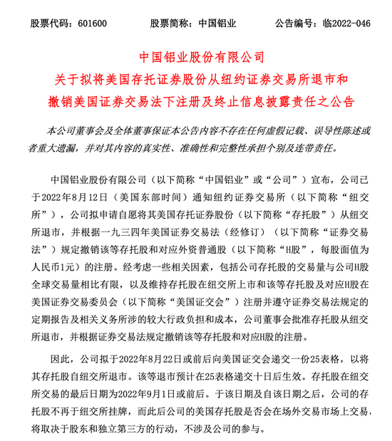 随后,中国铝业公告称,公司拟申请自愿将其美国存托证券股份从纽交所退市,并根据一九三四年美国证券交易法规定撤销该等存托股和对应外资普通股。