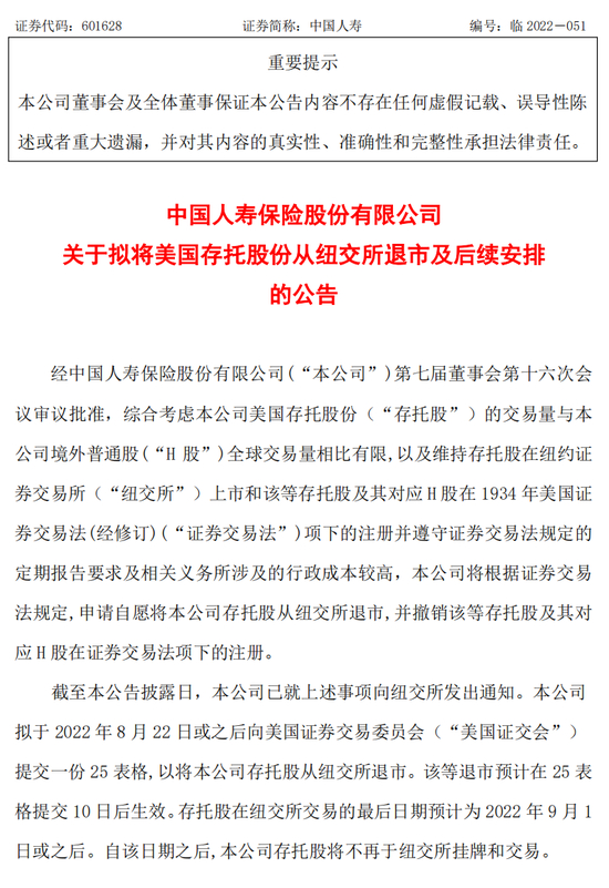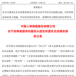8月12日,中国人寿发布公告称,将根据证券交易法规定,申请自愿将该公司存托股从纽交所退市,并撤销该等存托股及其对应H股在证券交易法项下的注册。