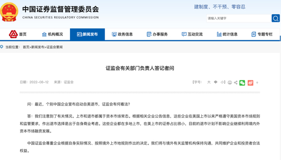问:最近,个别中国企业宣布启动自美退市,证监会有何看法?