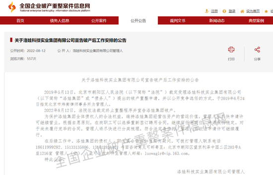 证券时报·e公司记者登陆全国企业破产重整案件信息网查询到了洛娃集团宣告破产后续工作安排的公告。