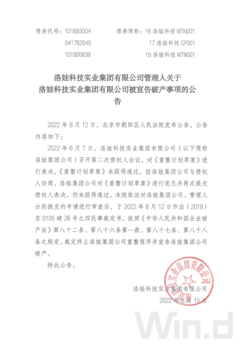 8月15日,洛娃集团公告称,8月12日,北京市朝阳区人民法院发布公告,因公司《重整计划草案》未获得债权人会议通过,法院裁定终止洛娃集团公司重整程序并宣告洛娃集团公司破产。