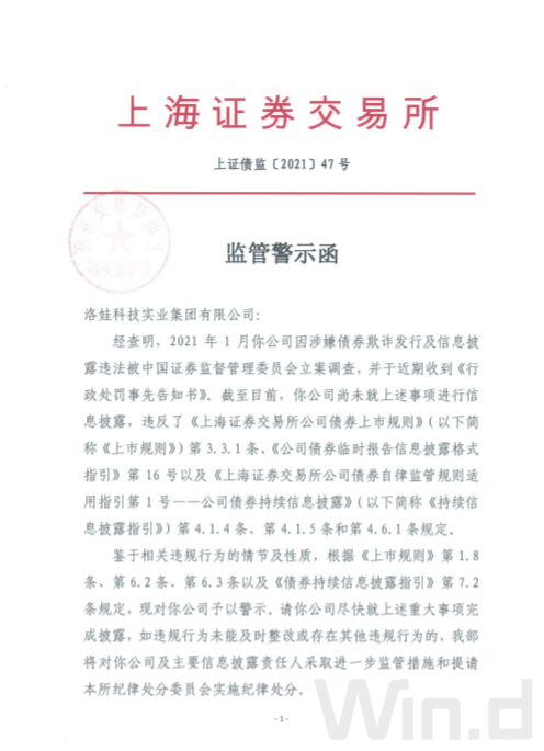 2021年12月1日,上交所发布监管警示函显示,2021年1月,洛娃科技实业集团有限公司因涉嫌债券欺诈发行及信息披露违法被中国证券监督管理委员会立案调查,并于近期收到《行政处罚事先告知书》。截至目前,洛娃集团尚未就上述事项进行信息披露。鉴于相关违规行为的情节及性质,现对洛娃集团予以警示。