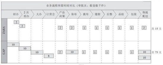 作为“快时尚”中的“慢”时尚,受制于复杂业务链,GAP的产品设计时间是ZARA的两倍,且打版流程需要与外部企业协同完成,导致整体出货时间是后者的5倍。