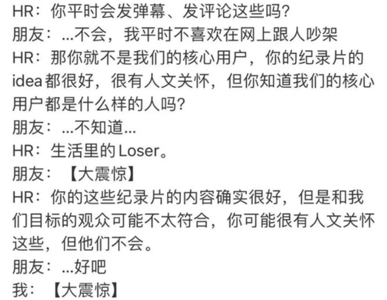 比如,哔哩哔哩HR对面试者说:B站核心用户都是生活中的Loser,并且大多缺少人文关怀。