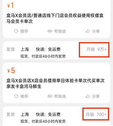 而且,因为体量的原因,会员店扩张的天花板也比较低,针对家庭购物的中高端客群,决定了会员店只能开在一线城市,顾客到店频率大约是2周1到2次,最高不超过1个月8次。一个有意思的现象是,在淘宝搜索盒马X会员店,会发现付费会员制背后还有一条会员租用产业链:1元可租用店主的会员二维码用来入店,如果需要付款,再付5元手续费即可。选择销量最高的店铺查看,借用次数和付款次数在不到1个月内,已经分别高达9万多次和700多次。这种较为奇特的租会员业态,是下沉市场单次消费需求的表现。