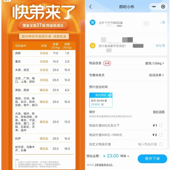 小程序上,从北京朝阳区发网成都双流区的界面显示,后天达(72小时达)1kg的服饰价格为23元,2kg价格为36元,10kg价格则优惠为140元。但相关费用的产生,界面并未有预估价格明细展示。