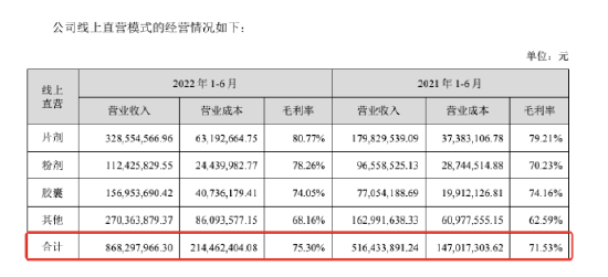 2022年上半年,汤臣倍健线上直营收入8.68亿,同比增长68%,综合毛利率75.30%,同比增长3.77个百分点,收入占比从12.3%提高至20.6%。