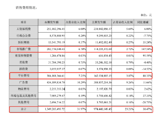 具体来看,销售费用主要增加在市场推广费和平台费这两项上。上半年,市场推广费2.83亿,同比增长147.54%;平台费3.06亿,同比增长88.33%。