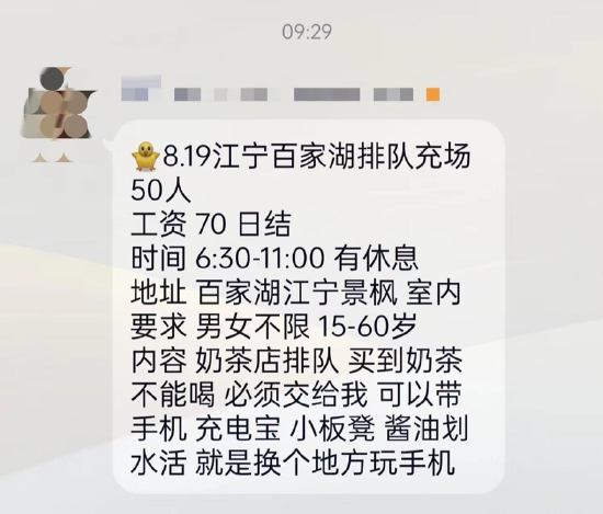 新浪科技在一个南京招聘QQ群中,看到了一则8月19日奶茶店排队充场的兼职信息。工资70元,日结,地址在百家湖江宁景枫,主要内容为奶茶店排队,并要求“买到奶茶不能喝,必须交给我,可以带手机、充电宝、小板凳。酱油划水活,就是换个地方玩手机。”