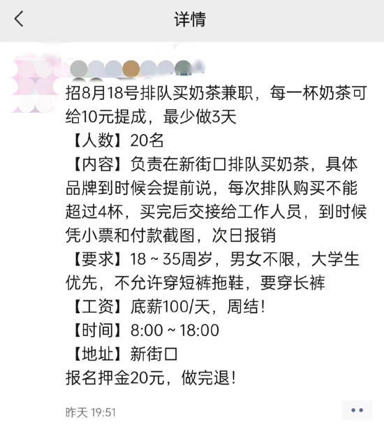 新浪科技在联系到该招聘人员后,发现他于8月17日发布兼职信息称,招8月18号排队买奶茶兼职,大学生优先,底薪100/天,每一杯奶茶可给10元提成,最少做3天。主要负责在新街口排队买奶茶,“具体品牌到时候会提前说,每次排队购买不能超过4杯,买完后交接给工作人员,到时候凭小票和付款截图,次日报销。”