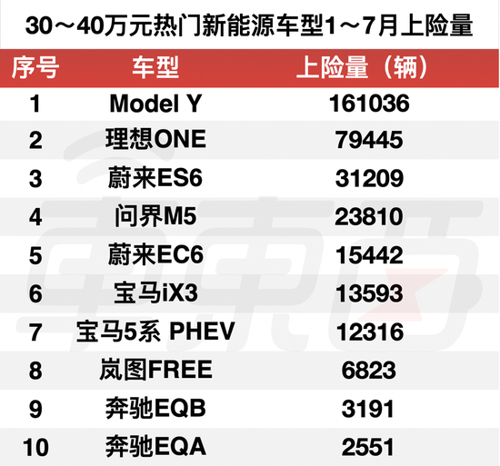 今年1~7月的上险量数据显示,理想ONE在10款30~40万元的热门新能源车型中,上险量仅次于特斯拉Model Y,位列第二,上险量是蔚来ES6的2倍还多。