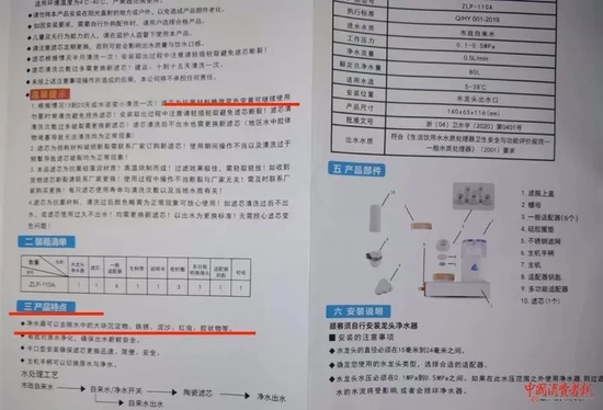 ▲说明书中的产品特点仅提到“可去除水中大块沉淀物、铁锈、泥沙、红虫、胶状物”。刘传江/摄