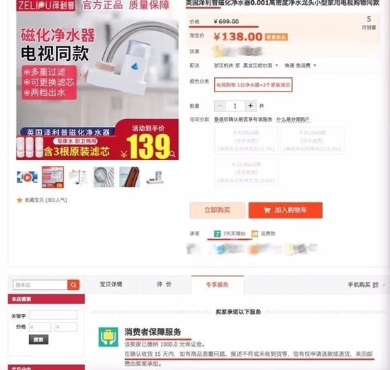 有的页面显示的净水器与电视购物是同款,也是138元一台净水器,外加3个滤芯,区别就是电视购物中的原价399元在网络购物平台上变成了699元;