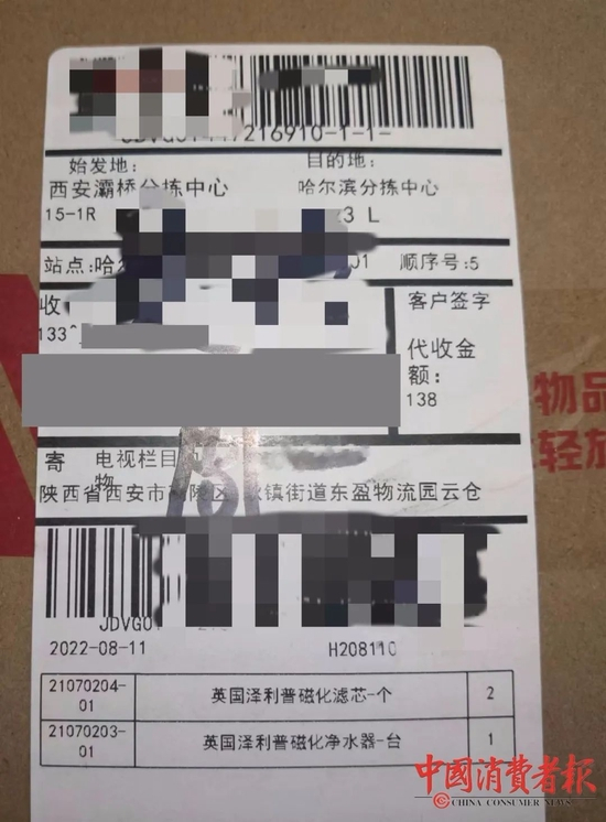 ▲净水器收货单上印有“英国泽利普”,发货地是陕西西安。刘传江/摄