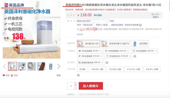 有的平台上,产品宣传页中除标注“英国泽利普”净水器外,更是直接加上了“英国品牌”,还附带有英国国旗图片。