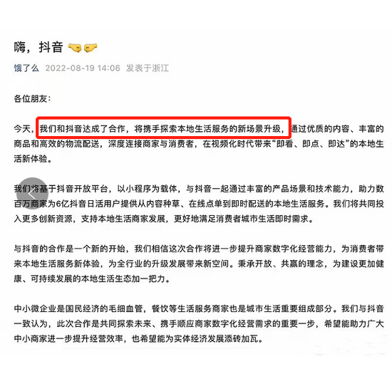 这两天,阿里旗下的饿了么宣布与抖音达成战略合作。