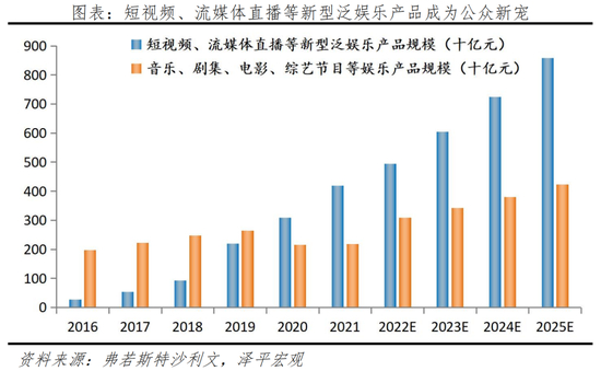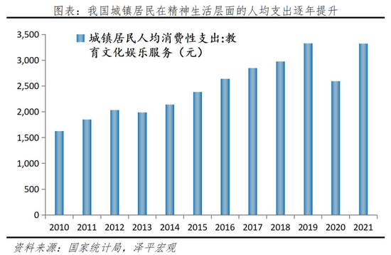 近年来,随着人均收入水平的提高,人们越来越重视精神生活的质量水平,我国城镇居民在教育、文化、娱乐服务层面的人均支出也在日益上升。叠加互联网等通信技术的进步,我国泛娱乐行业迎来井喷式的发展,根据弗若斯特沙利文的测算,包括短视频、流媒体直播、剧集、综艺节目、数字音乐、电影、在线文学及动画在内的中国泛娱乐市场规模从2016年的2442亿元增长至2021年的7003亿元,增长近2.9倍,年复合增速高达23.5%。未来消费升级推动娱乐需求进一步升级,消费者可以根据需求选择更专业化、特色化、细分化的娱乐供给,市场也将进一步保持高速增长态势。