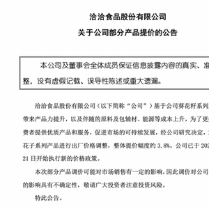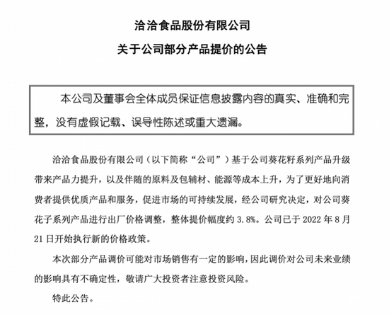 8月23日,洽洽食品发布公告称,对葵花籽系列产品进行出厂价格调整,整体提价幅度约3.8%。公司已于2022年8月21日开始执行新的价格政策。