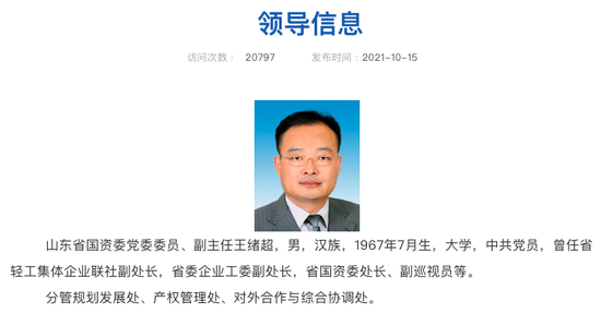 山东省国资委网站“领导信息”一栏显示,王绪超曾任省轻工集体企业联社副处长,省委企业工委副处长,省国资委处长、副巡视员等。在担任省国资委党委委员、副主任时,分管规划发展处、产权管理处、对外合作与综合协调处。