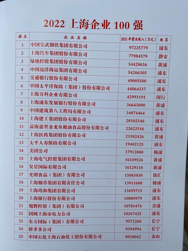 当天发布的2022上海百强企业排行榜显示,宝武集团、上汽集团、绿地集团、中远海运、交通银行、太平洋保险、上海万科、浦发银行、中建八局、建工集团排在2022年上海百强企业前十名。前十强中,6家位于浦东、2家位于黄浦,静安、闵行各1家。