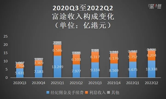 整体来看,富途始终在赚钱,只是最近一年多赚得没那么猛,也没那么快。我们可以从富途的收入构成中看到可能的原因。