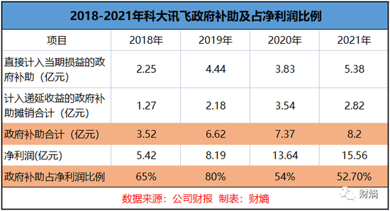 利润方面,科大讯飞每年都会收到一大笔政府补助,这较大地影响了公司的净利润。据财熵统计,科大讯飞近年来收到的政府补助,占公司净利润比例常年在50%以上。