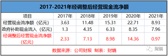 如上所述,科大讯飞每年会收到一大笔政府补助,若剔除政府补助的现金流入,公司的经营现金流会逊色不少。比方说2021年,若剔除政府补助的现金流入,公司的经营现金流净额甚至不足1亿元。(注:经调整后经营现金流净额=经营现金流净额-政府补助现金流入)