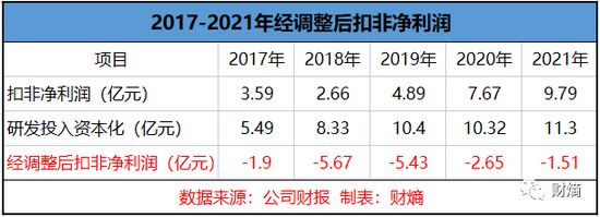 2021年,科大讯飞的扣非净利润为9.79亿元,而研发投入资本化就高达11.3亿元。若研发投入全部费用化,经调整后的扣非净利润为-1.51亿元。财熵统计近5年来数据,发现该数值均为负数。换言之,真实的科大讯飞可以说是亏损的。(注:经调整后扣非净利润=扣非净利润-研发投入资本化金额)