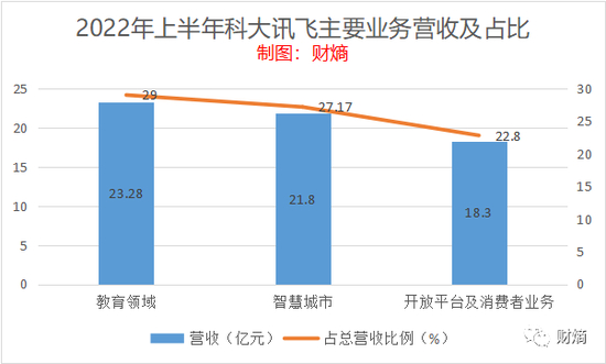 分业务看,目前科大讯飞的主要收入来自智慧教育、智慧城市和开放平台及消费者业务,2022年上半年,这三个板块合计贡献约八成的营收。