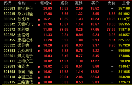 今日,卫星互联网概念集体走高。截至收盘,神宇股份“20cm”涨停,华力创通涨约18%,欧比特涨逾16%,国科微涨近12%,合众思壮、烽火电子、海能达、中国卫星、三维通信等约10股涨停。