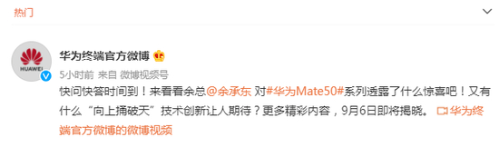 另外,华为常务董事、终端业务CEO余承东在Mate50预热视频中直言,华为即将发布一项“向上捅破天”的技术。