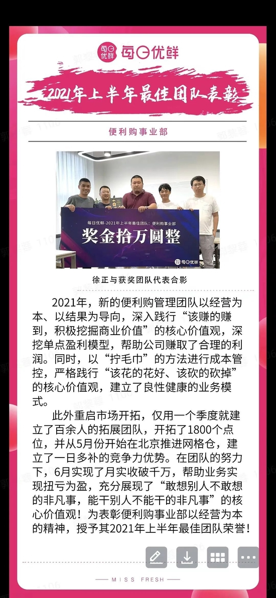 据悉,王安永于今年7月中旬就进入了每日优鲜便利购,开始逐步接手团队和各项业务。