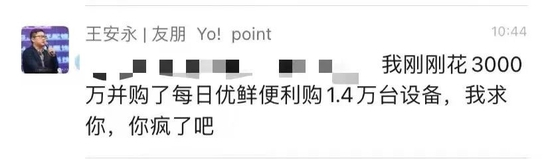 同时,更令人纳闷的是,此次收购便利购业务的友朋创始人王安永曾在微信群聊中明确表态称,“我刚刚花3000万并购了每日优鲜便利购1.4万台设备,我求你,你疯了吧。”