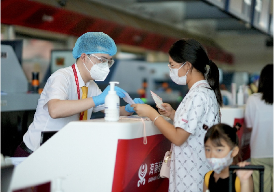 附图:暑运期间,海口美兰机场值机人员为旅客办理乘机手续(李耀乐 摄)