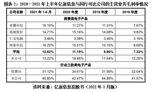 如图表2所示,2018—2021年上半年,亿道信息消费类电子产品毛利率分别为12.26%、17.64%、18.46%和13.22%,总体高于同行公司平均水平;另外,在行业三防类电子产品领域,亿道信息的毛利率也远高于同行可比公司优博讯。