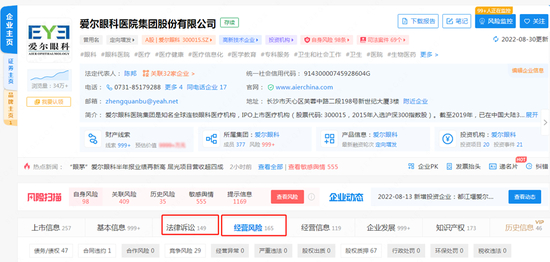 从风险扫描信息来看,爱尔眼科医院集团目前涉及法律诉讼149起,经营风险165项。据爱尔眼科发布的《2021年度创业板向特定对象发行股票募集说明书(注册稿)》,爱尔眼科报告期内(2019年至2022年3月31日)存在因违法违规受到行政处罚80项,涉及罚款金额合计236.78万元,主要涉及医疗广告、卫生监管、消防等方面。