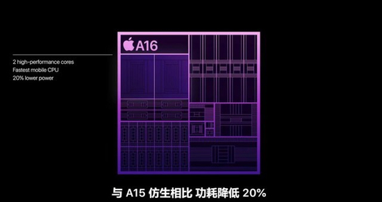 据了解,A16芯片集成了160亿个晶体管为苹果史上最高,也是首款4nm制程芯片,比竞品快40%,和A15比,功耗降低了20%,为竞争对手的三分之一。5核GPU 让图像处理能力大幅提升,更让摄像头划时代地增加到4800万像素,感光器比iPhone 13 Pro大,并加入24毫米微距摄像头。新的传感器让低光效果提升2倍,并带来2倍长焦选项。